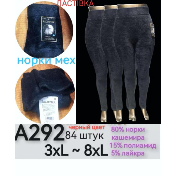 Ластівка A292 — це зимові жіночі легінси батал, виготовлені з м’якого матеріалу з високим вмістом норки та кашеміру. Усередині теплий і щільний хутро, який забезпечує максимальний захист від холоду. Безшовна конструкція гарантує зручність і комфорт під час носіння, еластична тканина добре тягнеться та підходить для різних типів фігури. Склад: 80% норка-кашемір, 15% поліамід, 5% лайкра. Розміри: 3XL–8XL. Упаковка — 84 шт.