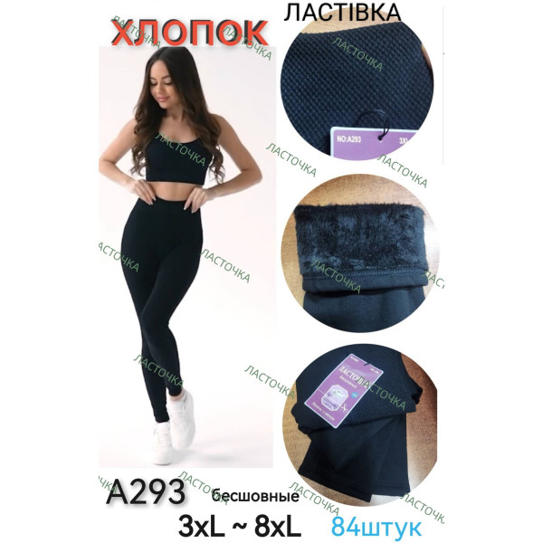 Ластівка A293 — це жіночі зимові легінси батального розміру, виготовлені з бавовняної тканини та утеплені товстим хутром усередині. Модель безшовна, щільна й еластична, добре зберігає тепло та створює максимальний комфорт під час носіння. Ідеально підходить для холодної пори року. Розміри: 3XL–8XL. Упаковка — 84 шт.