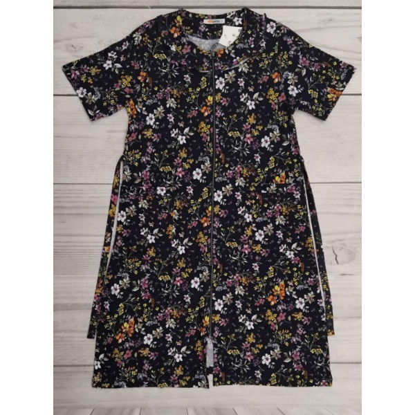Жіночий халат Samo 3337 на блискавці, розміри 48–56. Модель з коротким рукавом, кишенями та поясом. Темний фон з яскравим квітковим принтом. Комфортний для дому. В упаковці 1 колір. Опт.